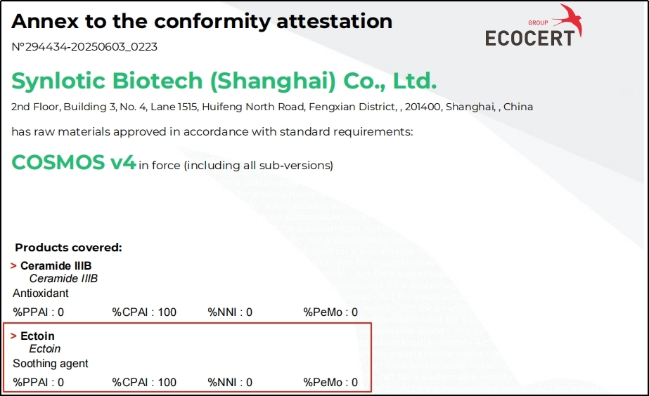 최근 Shanghai Yunluo에서 생산한 Yikeduoyin은 프랑스 ECOCERT에서 부여한 EU COSMOS 천연 인증을 획득했습니다.